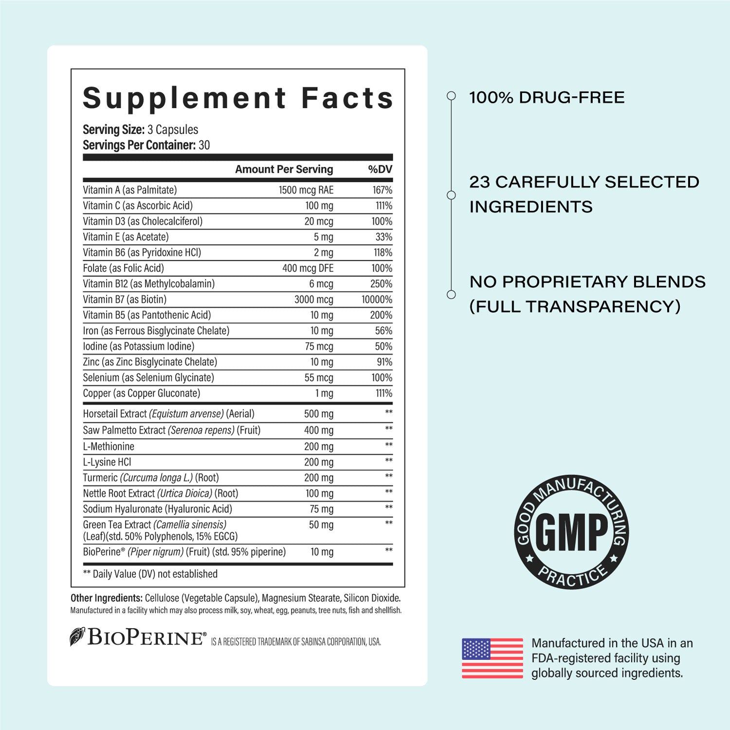 Includes sodium hyaluronate (hyaluronic acid) to support skin and scalp hydration, along with BioPerine® to help enhance nutrient absorption and bioavailability.*